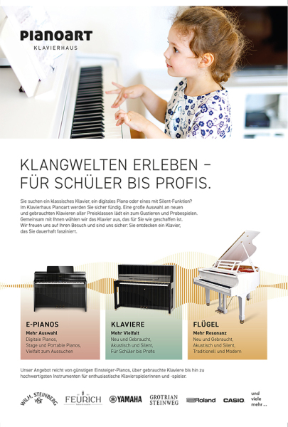 Unser Klavierhaus ist gewachsen! Mit Stolz präsentieren wir Ihnen nun unsere 7 exklusiven Schauräume, die Ihnen ein noch intensiveres und vielfältigeres Vor-Ort-Erlebnis in unserem Klavierhaus bieten. Diese Erweiterung spiegelt unseren kontinuierlichen Anspruch wider, Ihnen als Markenprimus der Klavierbranche nur das Beste zu bieten.