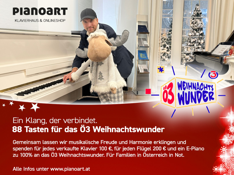 Gemeinsam lassen wir musikalische Freude und Harmonie erklingen und spenden für jedes im Dezember verkaufte Klavier 100 € und für jeden Flügel 200 € zugunsten des Ö3 Weihnachtswunders – im Klavierhaus & Onlineshop.